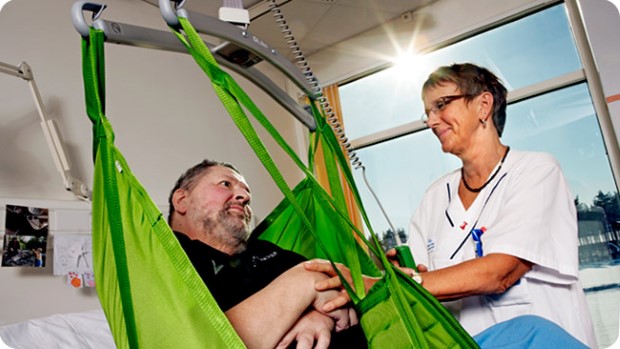 Group homes can be homes for people with both psychic and physic disabilities; some are completely independent in their transfers, whereas multi-handicapped patients, for instance, can have a very big and specific need for help. For these patients, who cannot themselves participate in the transfers, the choice of sling fabric and fit is extremely important in order to handle the task in the best possible way.